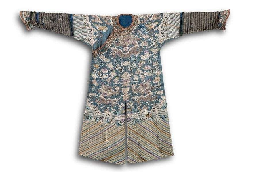 Robe de cour en soie tissée à fond bleu, décorée de huit dragons à quatre griffes, sur fond de nuages à la recherche de la perle sacrée, encadrés d'objets précieux, de poissons, conques, chauve-souris et motifs fleuris et à la base pics et vaguelettes.