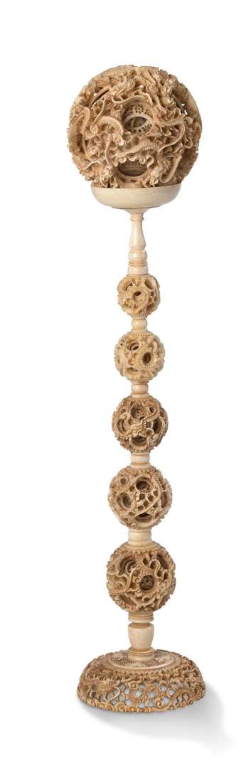 Grande boule de Canton concentrique en ivoire à décor ajouré de neuf dragons parmi des nuages stylisés, découvrant une série de sphères mobiles internes sculptées de motifs géométriques, reposant sur une tige elle-même composée de cinq boules de Canton de formes diverses reprenant le décor de la sphère principale, soutenues par un socle hémisphérique à décor ajouré de dragons.