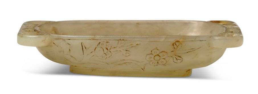Petite coupe en jade céladon, à décor de fleurs de prunus et pins de longévité.