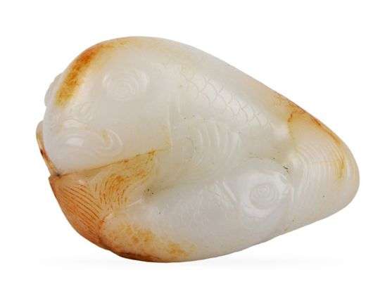 Jade blanc représentant deux carpes sur une fleur de lotus, une grande et une petite s'enlaçant.