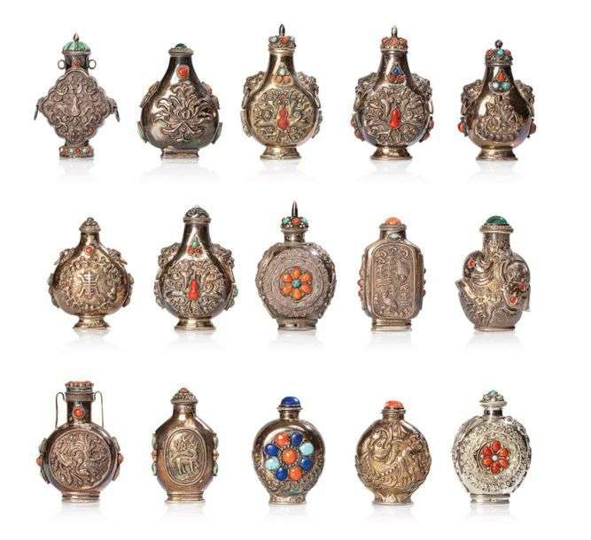 Quatorze tabatières de forme gourde et balustre à décor pour sept d'entre elles de sujet animaliers (phénix, daims, poissons)| les sept autres à décor de motifs de fleurs principalement de lotus et frises de ruyi. L'une à décor de motifs calligraphiés. Toutes ornées de cabochons de corail, turquoise et lapis-lazuli.