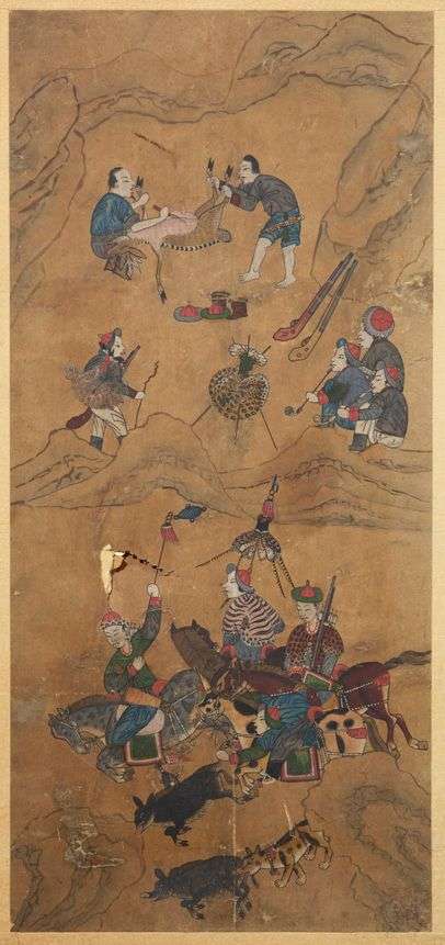 Paravent à quatre feuilles, à décor de scènes de chasse, les cavaliers tirant à l'arc sur des daims, cerfs et oiseaux. L'une des feuilles représentant l'arrivée de musiciennes.