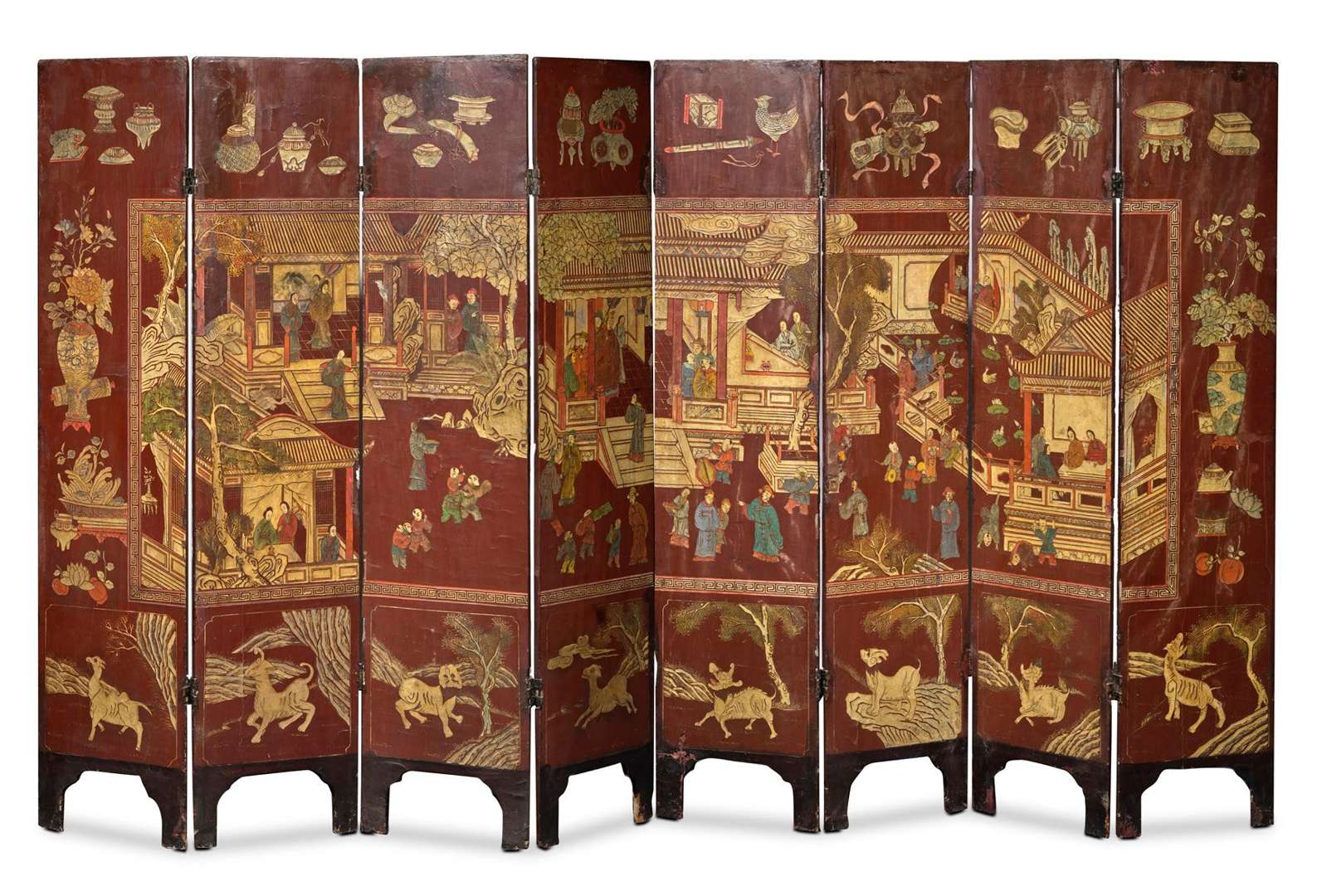 Grand paravent en laque de Coromandel à huit feuilles à décor double-face, d'une scène de pavillons animés de personnages sur une face encadrée par une série d'animaux du zodiaque en partie basse et objets mobiliers et vases fleuris en partie haute et latérale. Sur l'autre face, un phénix trônant parmi un paysage d'arbustes en fleurs, papillons et oiseaux. La partie basse composée de bouquets floraux.
