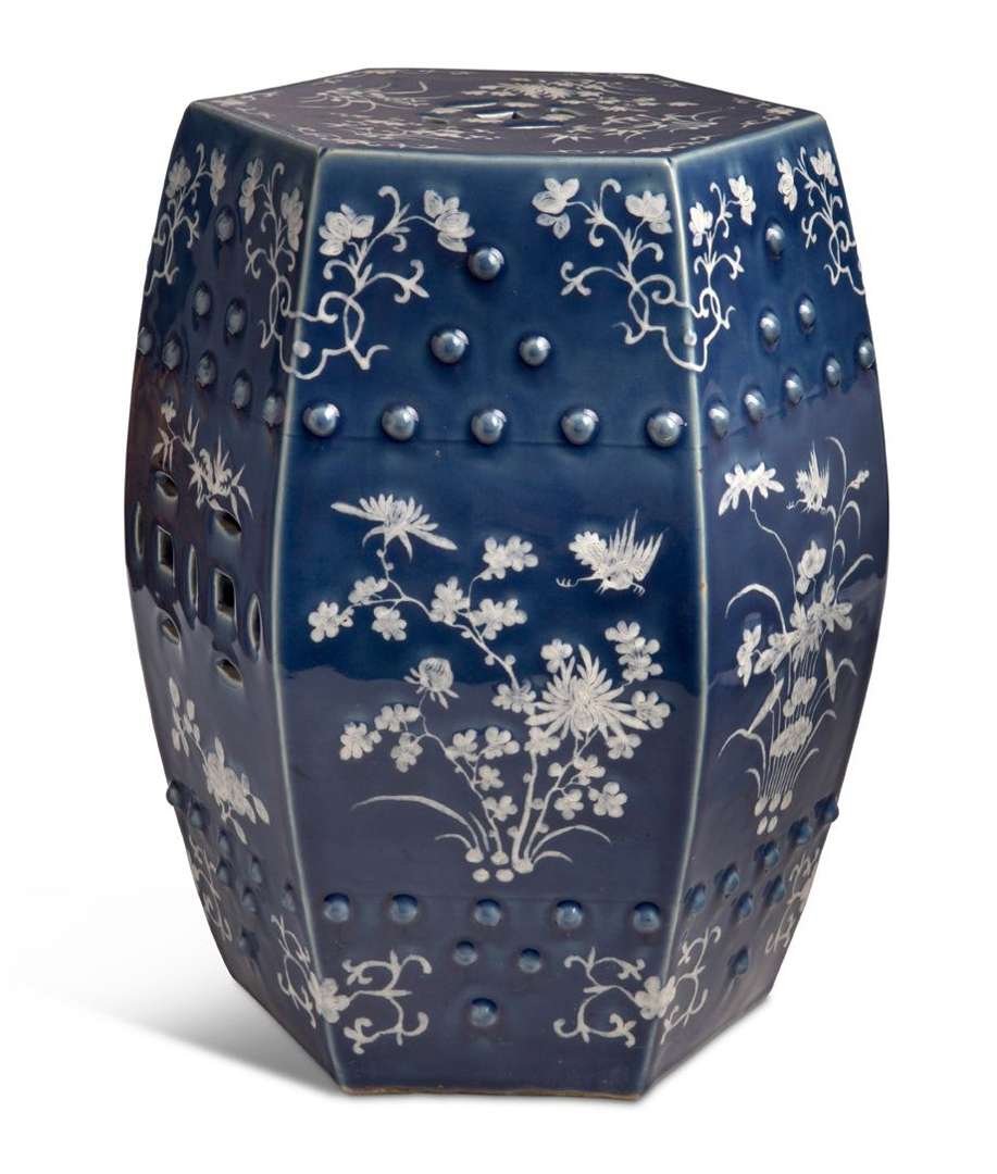 Tabouret de jardin en porcelaine et émail bleu saphir, à décor en léger relief de fleurs et bouquets.