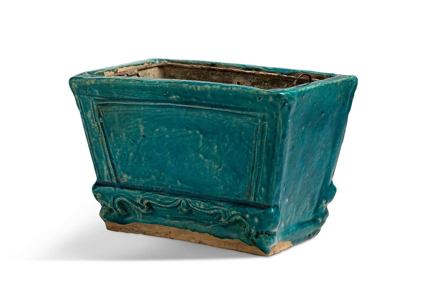 Jardinière rectangulaire en céramique émaillée bleu turquoise, à décor moulé sous couverte de motifs de fruits et végétaux et d'un piètement de forme galbée.
