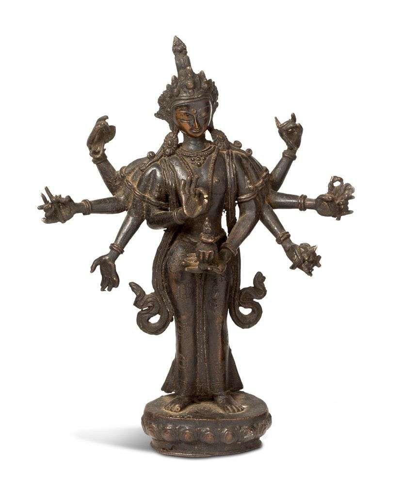 Sujet en bronze de patine brune représentant Avalokiteshvara à huit bras, debout sur un lotus épanoui, les mains tenant divers attributs.