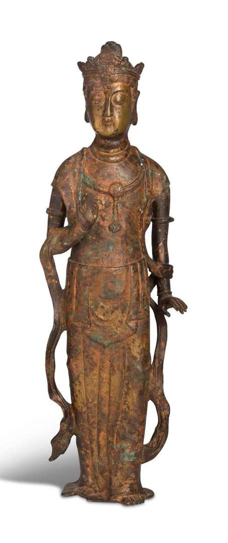 Sujet en bronze et traces de dorure, représentant un Boddhisattva debout, une main en abhaya mudra.