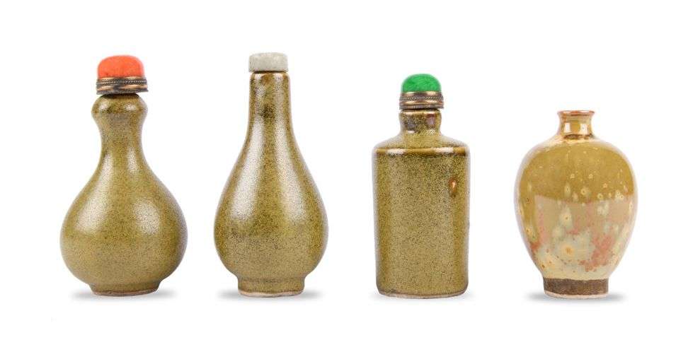 Quatre flacons-tabatières en porcelaine de formes diverses, un émaillé beige et trois émaillés poussière de thé, avec marque à la feuille sur la base.