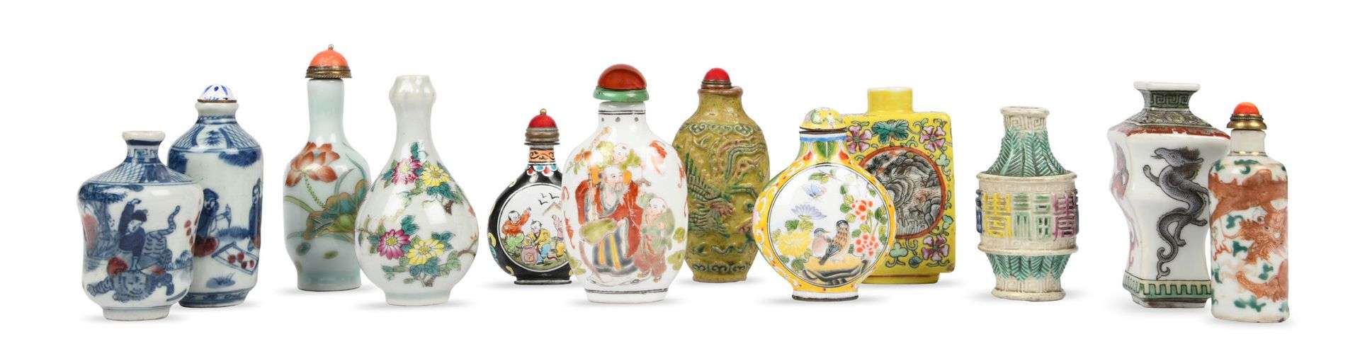 Lot de dix flacons-tabatières en porcelaine, à décor de style famille rose, style famille verte, bleu blanc, orné de personnages, fleurs. On y joint deux flacons en émaux de Canton.