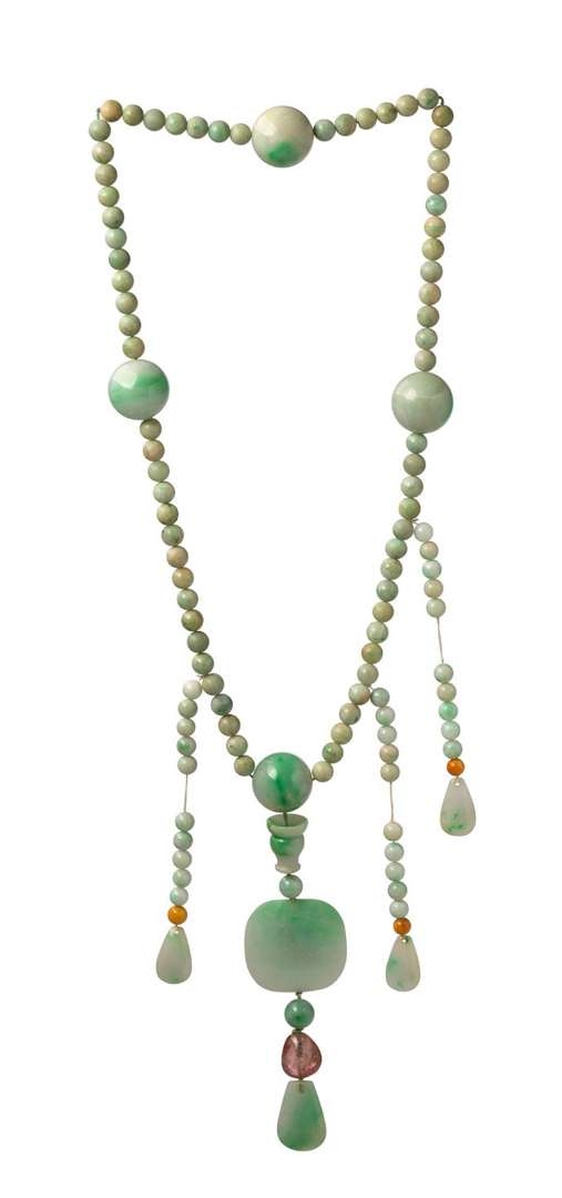 Collier de perles en jadéite à quatre pans avec pendentif en tourmaline sur le pan principal.