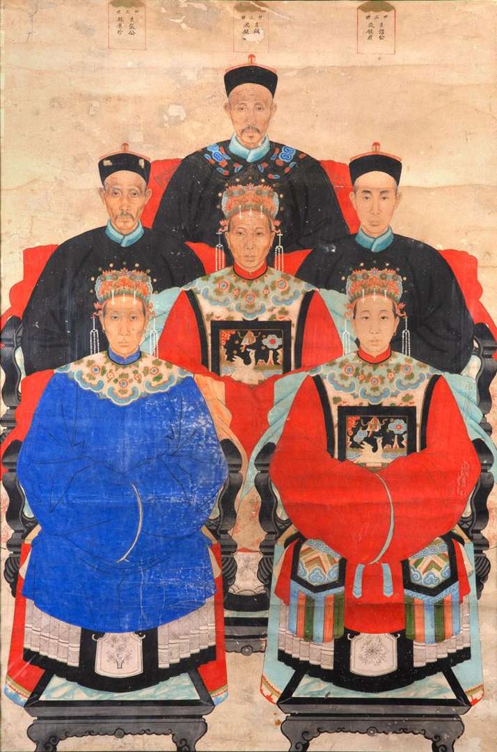 Peinture à l'encre et couleurs représentant des dignitaires mandchous assis sur des trônes.
