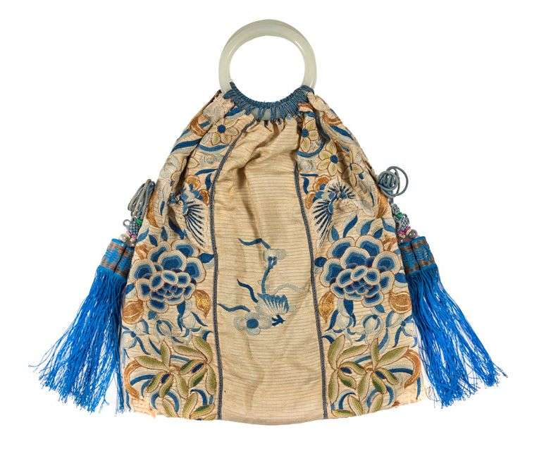 Lot de quatre textiles comprenant le dos et la partie avant d'une veste en soie corail brodée aux fils dorés et polychromes d'un dragon de face entouré de deux phénix et deux petits dragons de profil parmi des motifs auspicieux au-dessus de flots d'où émergent une pagode et surmontant une bande de lishui animés de deux chiens de Fô | un petit sac en soie crème brodée de motifs floraux en camaieu de fils bleus, dorés et polychromes, les anses formées par deux anneaux en verre blanc | et un napperon rectangulaire en soie corail brodée d'un dragon à cinq griffes avec bordure en soie à décor de motifs stylisés.