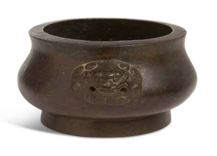 Brûle-parfum de forme circulaire en bronze de patine brun rouge, flanqué de deux têtes de lion. Marque apocryphe Ming sur la base.