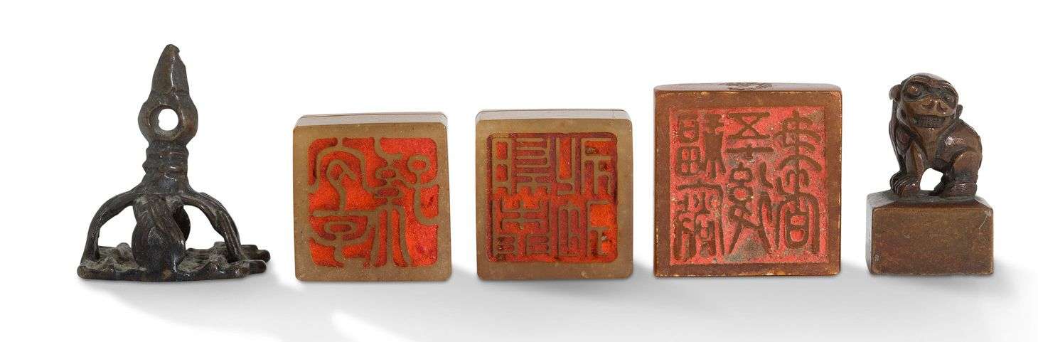 Dim. trois petits sceaux : 2 x 2 cm - 2 x 1,5 cm - 2 x 2 cm Dim. sceau en jade gris-blanc : 7 x 4,6 x 4,6 cm L. repose-pinceaux : 9,5 cm H. flacon en bec de calao : 8 cm H. tabatière en jade : 8,4 cm