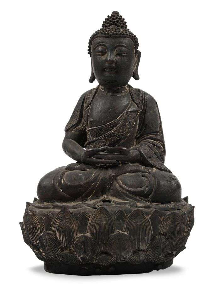 Sujet en bronze de patine noire, représentant le Bouddha assis en méditation sur un lotus, les mains en dhyana mudra.