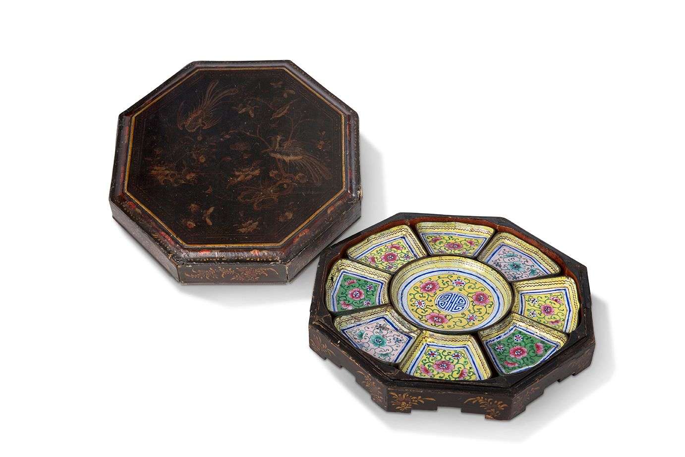Coffret de forme octogonal en laque noir et or à décor d'oiseaux, comprenant neuf raviers en émaux de la famille rose sur cuivre, en forme de fleurs de lotus, à décor de fleurs et rinceaux feuillagés autour du caractère shou.