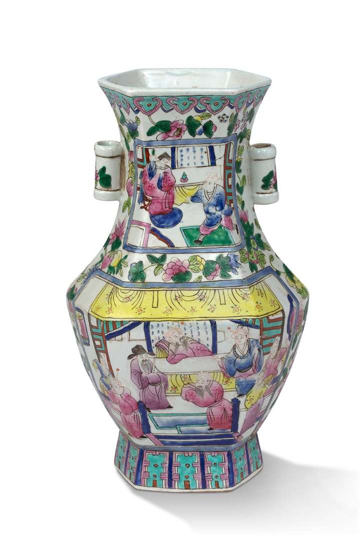On y joint un vase hexagonal (Chine, XXe siècle) en porcelaine et émaux de la famille rose, à décor en médaillons de scènes animées de personnages, deux anses sur le col, une frise stylisée sur le pied.