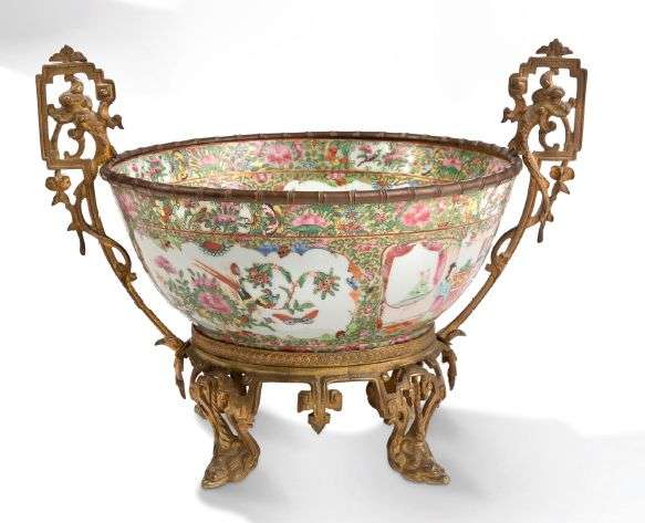 Coupe en porcelaine de Canton, à décor en émaux de la famille rose de scènes animées de personnages alternant avec des oiseaux et fleurs. Monture en bronze enserrant la base, le bord et rehaussé de deux anses.