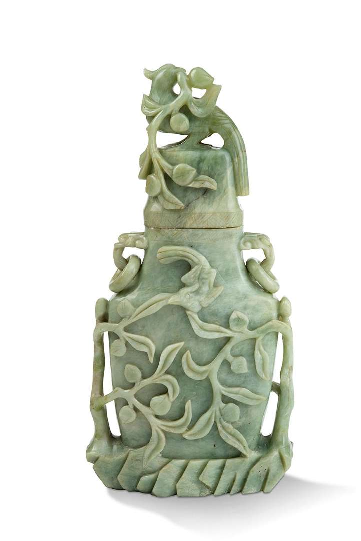 Vase couvert en serpentine céladon légèrement veinée de blanc, sculptée sur son pourtour en haut-relief et ronde-bosse de deux pêchers avec feuillages et fruits. Le couvercle surmonté d'un oiseau tenant une branche de pêcher dans son bec. Deux anses retiennent des anneaux mobiles.~