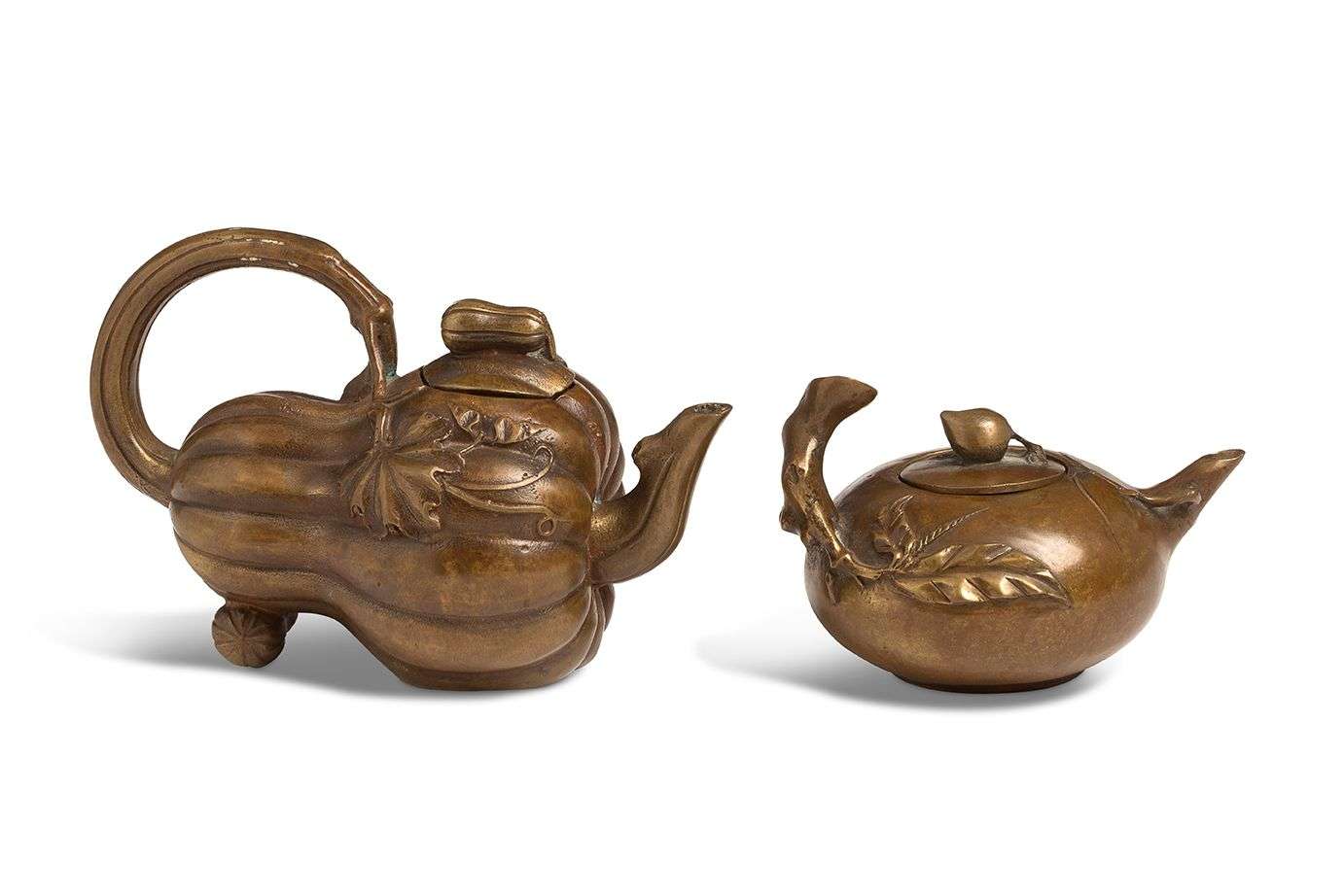 Deux verseuses en bronze, l'une en forme de citrouille, l'autre en forme de pêche de longévité. Marque d'atelier sur la première.
