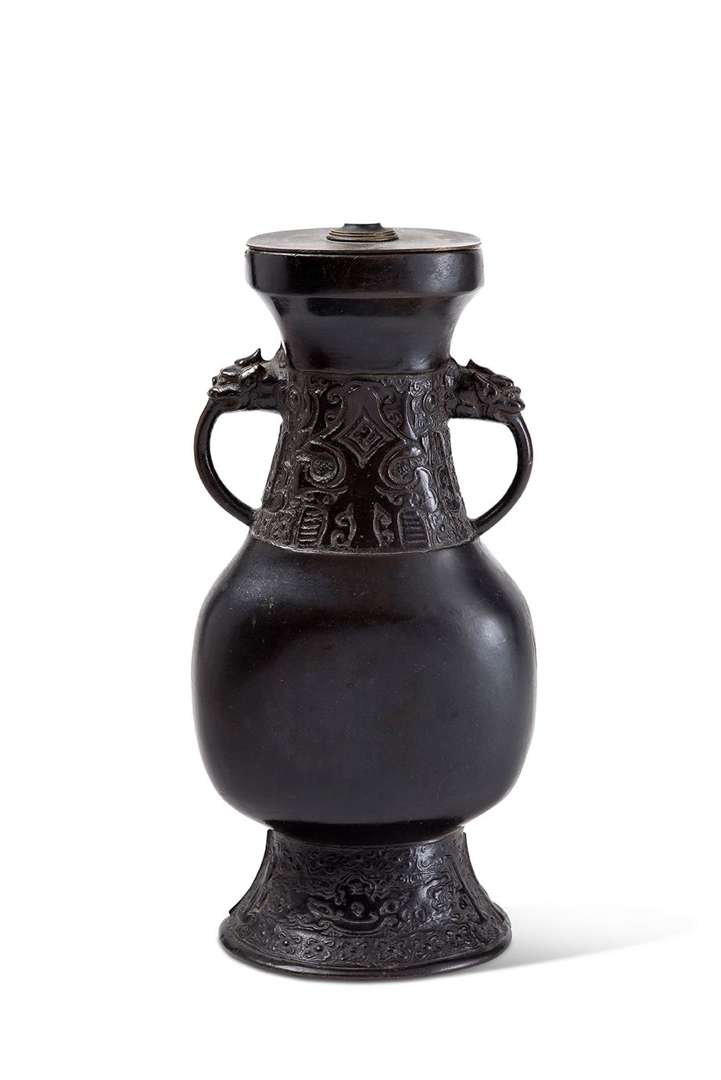 Vase en bronze de patine brune, le col et le pied à décor archaïsant. Le col rehaussé de deux anses crachées par des têtes de Qilin.~