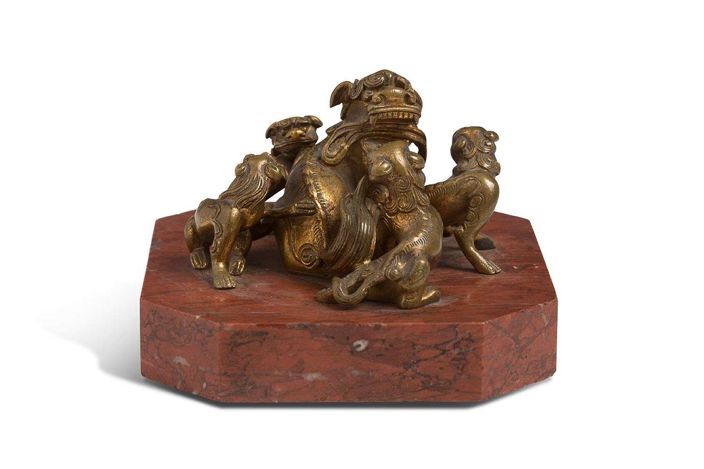 Groupe en bronze patine médaille représentnt un lion bouddhique jouant à la balle avec ses quatre petits. Sur un socle rouge à l'imitation du marbre.