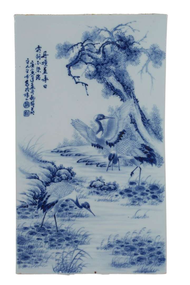 Plaque verticale en porcelaine bleu-blanc, représentant trois grues au bords d'un cours d'eau, auprès d'un pin. Accompagnée d'un poème et signée Wang Bu.