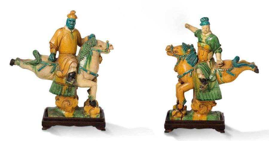 Deux tuiles faîtières en céramique émaillée vert, ocre, jaune et bleu, représentant deux cavaliers, les chevaux au galop.