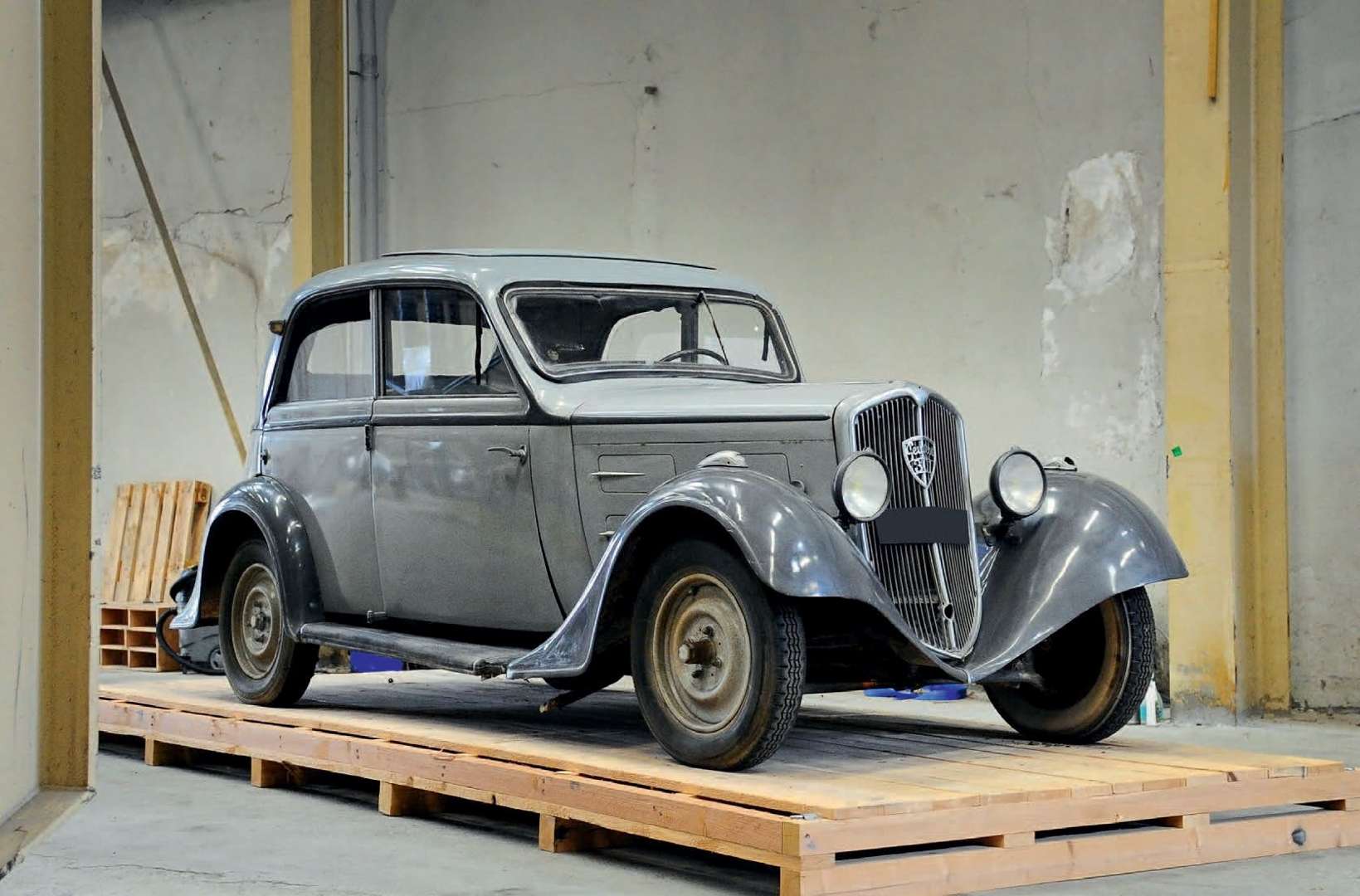 Le début des années 1930 marque la démocratisation de l’aérodynamisme dans les lignes automobiles. Chaque constructeur tente d’harmoniser sa gamme avec des modèles au style plus contemporain, dont Peugeot avec sa 301 en version Profilée. L’exemplaire que nous présentons est dans un état de de conservation avancé, mais est très sain. Sa peinture n’est pas celle d’origine, et témoigne d’une restauration ancienne de qualité. L’intérieur est quant à lui complet, mais la sellerie est dans un état d’usage assez marqué. Du point de vue mécanique, une restauration sera nécessaire, mais l’ensemble ne semble pas présenter de manques. Voici l’opportunité d’acquérir l’une des rares survivantes des 301 version profilée !