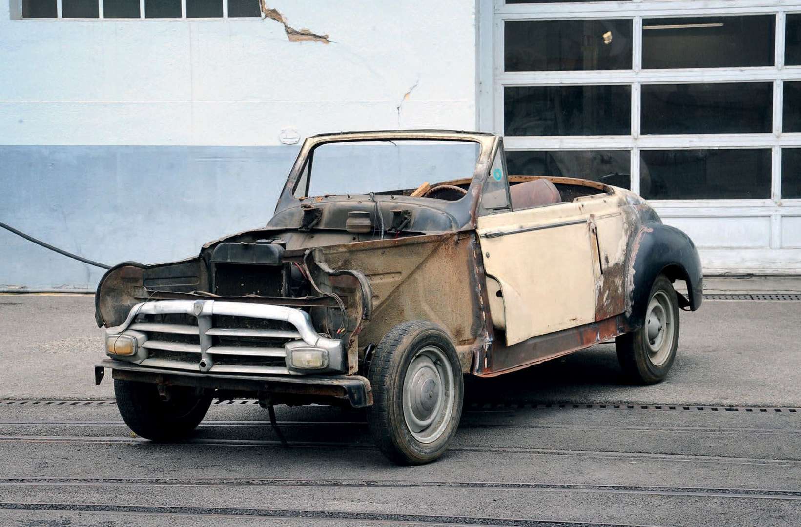 L’ exemplaire que nous présentons est une Peugeot 203 cabriolet. Selon les registres de l’usine cette auto a été livrée le 29 septembre 1952. Sa caisse portait le numéro 967 et sa carrosserie était de couleur rouge foncée code 464. A l’intérieur, on retrouvait une sellerie en cuir et une instrumentation Jaeger. Cette auto a certainement eu une vie tumultueuse ne permettant pas de conserver son châssis d’origine. Les éléments de carrosserie spécifiques au cabriolet ont ainsi été prélevés sur la caisse pour être assemblés sur un châssis de 203 C berline de 1955. Cette auto constitue aujourd’hui une intéressante base de restauration qu’il conviendra de mener à son terme.