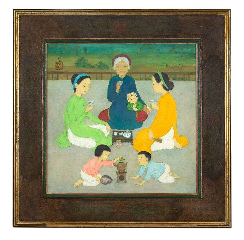 Si cette représentation de l’art du thé est particulièrement délicate, elle illustre également une autre valeur forte extrême-orientale : la famille. Plusieurs générations composent cette oeuvre et rappellent l’importance de la structure familiale. Si la lecture de cette oeuvre repose sur deux piliers de la culture natale de l’artiste, il parvient également à y insuffler de multiples références occidentales. En effet, fort de son apprentissage à l’École des Beaux-Arts d’Hanoï, mais aussi imprégné des techniques européennes qu’il peut admirer quotidiennement, Mai Thrung Thu reprend le savoir-faire de son continent d’adoption. Ainsi, les plis des tenues traditionnelles ne sont pas sans rappeler le drapé mouillé de l’art classique grec tandis que la séparation des plans évoque les portraits de la Renaissance. Les tonalités habilement choisies, se font discrètement écho et forment une joyeuse composition. L’exposition de cette oeuvre en 1971 à la Galerie Jacques Doucet témoigne de la reconnaissance du talent de l’artiste par son pays d’adoption.