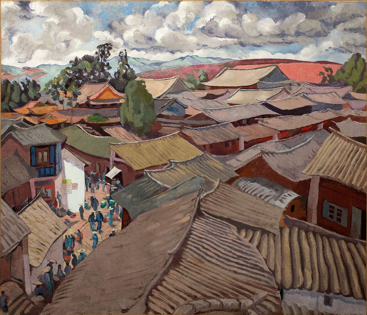 Curieuse et éternelle exploratrice, Alix Aymé a consacré sa carrière à représenter la particularité des us et coutumes des pays explorés. Maîtrisant aussi bien la laque, que le fusain ou encore l’huile, elle s’est attachée à retranscrire fidèlement cette Asie du Sud-Est à travers des paysages colorés mais aussi des portraits d’indigènes. Parmi ses voyages, la beauté hétéroclite des paysages du Yunnan et plus particulièrement de la ville de Yunnanfu a marqué son oeuvre. Capitale antique de cette province chinoise, cette ville traversée par le chemin de fer du Yunnan est connue pour son marché animé et ses multiples pagodes. Charmée, Alix Aymé la décrit en ces mots « Mon enthousiasme n’est pas de mauvais aloi. Yunnanfou me paraît la plus belle ville du monde.»