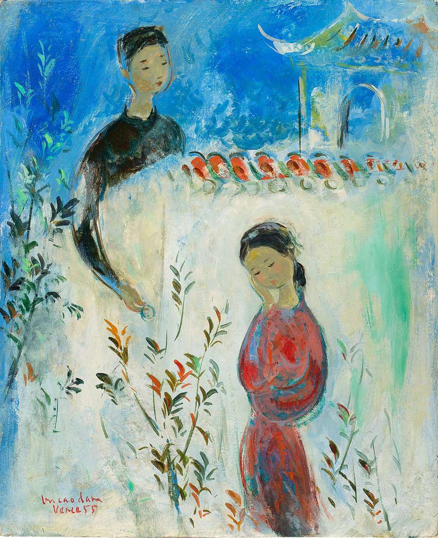 L’anneau de jade illustre un passage du poème vietnamien Truyện Kiều (le conte de Kieu) ou Kim-Vân-Kiêu rédigé par Nguyễn Du (1765−1820) au début du XIXe siècle. OEuvre essentielle à la culture vietnamienne, elle est rédigée en vers. Reprenant une ancienne histoire chinoise, ce poème est marqué par les principes confucéens qui régissent la culture vietnamienne. Ainsi, il est conté l’histoire d’une belle et talentueuse jeune fille, Kim, qui se sacrifie pour la piété filiale, valeur essentielle au confucianisme. Le rayonnement et la portée de cette oeuvre perdure auprès des vietnamiens expatriés. Bien que résident français depuis la fin des années 1930, Vu Cao Dam reste profondément attaché à sa terre natale et trouve inspiration auprès de ce conte. Reprenant un passage du chapitre V, l’artiste immortalise sa vision de l’histoire. Kim et Kieu se rencontrent lors d’une balade et s’éprennent l’un de l’autre. Le jeune poète décide de se déclarer et de témoigner son engagement en offrant deux bracelets en or. Dans L’anneau de jade, l’artiste replace les personnages selon la tradition mais s’affranchit également en représentant un bracelet non plus en or mais en jade. Ce choix hautement symbolique rappelle l’attachement de la culture orientale à cette pierre chargée de sens. Spirituelle et royale, elle affirme l’inclination et le respect de l’artiste pour son pays. Reprenant un style caractéristique à travers une palette emblématique, des visages emprunts de douceurs mais aussi cette touche brossée propre, L’anneau de jade s’inscrit dans une période charnière. Réalisée au milieu des années 1950, elle illustre les explorations de l’artiste vers la peinture à l’huile.