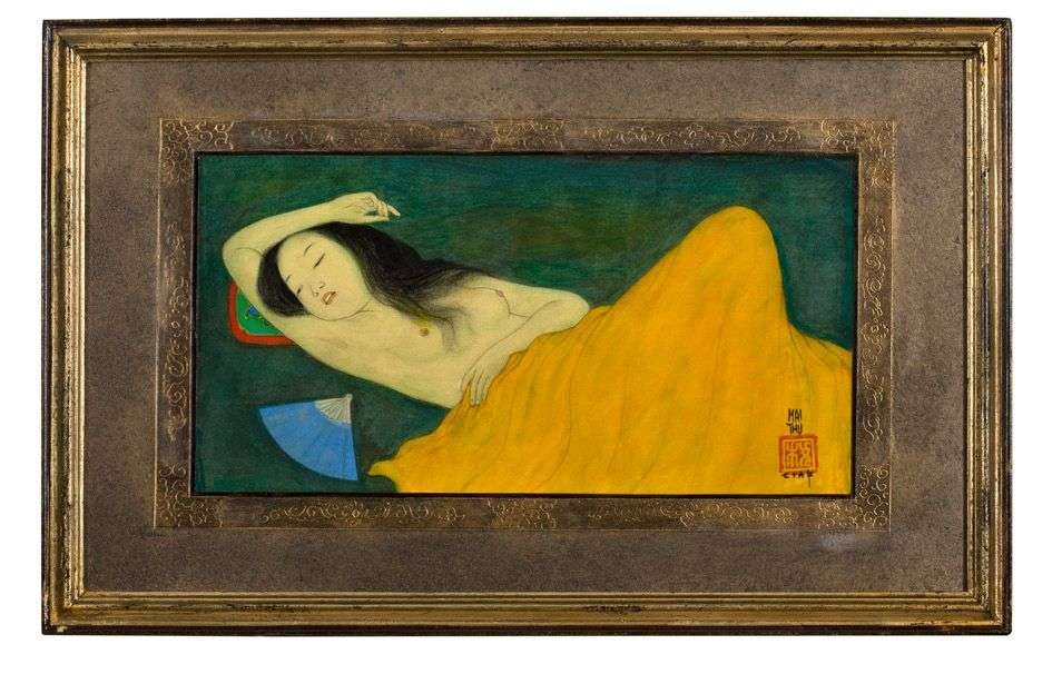 Dans Le Sommeil, Mai Trung Thu offre la vision d’une figure plus sensuelle. Une jeune femme est assoupie lascivement, le torse dénudé. La chevelure défaite rend ce moment d’autant plus intime. La composition dénuée d’artifice se concentre sur l’essentiel. Seul un éventail ouvert et un bout de coussin brodé sur lequel repose la jeune femme apportent des éléments de lecture. Typiquement asiatiques, ils permettent de souligner les origines du modèle. Réalisée à la fin de sa vie, cette composition illustre la liberté acquise par l’artiste. Reprenant la technique d’encre et couleurs sur soie apprise à l’Ecole des Beaux-Arts d’Indochine, Mai Trung Thu traite le sujet