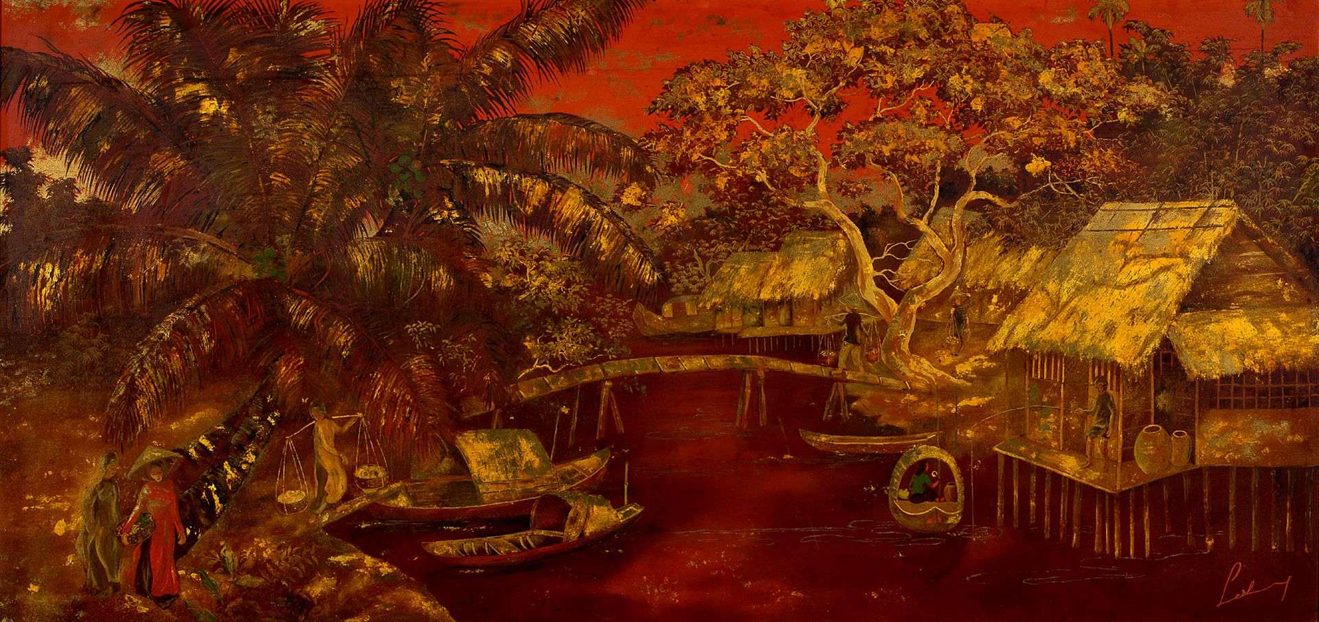 Lacquer with gold highlights, signed lower right