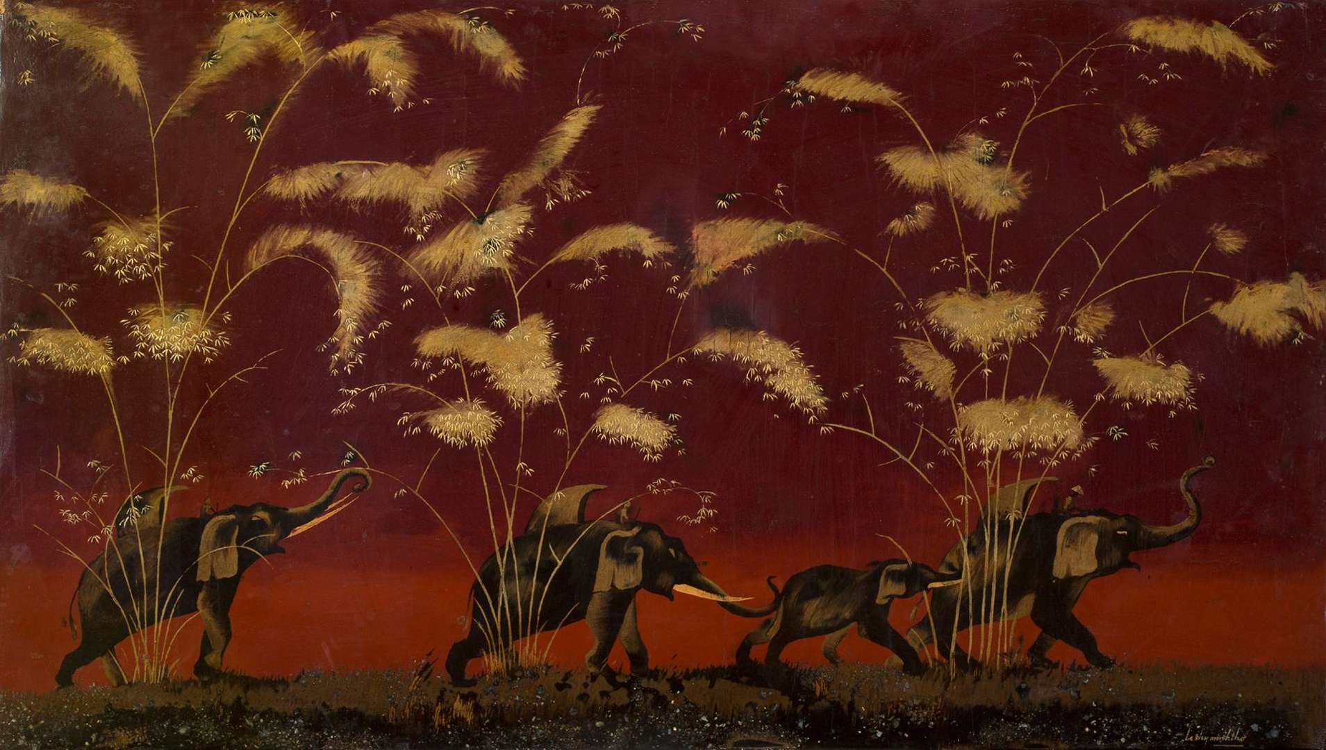 Lacquer with gold highlights, signed lower right