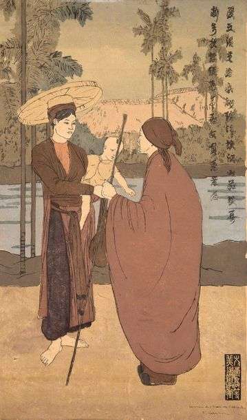 Mộc này đã xuất hiện trên những bức khắc gỗ danh tiếng khác, như Cò Cá của Nguyễn Nam Sơn (khoảng 1927), hoặc Bến thuyền sông Hồng của Đỗ Đức Thuận (1898-1970, khoá 2, 1931). Sử dụng kỹ thuật khắc gỗ cổ truyền, Nguyễn Tường Tam thể hiện một người phụ nữ trẻ Bắc Kỳ với áo tứ thân truyền thống, đội nón quai thao, và một phụ nữ đứng tuổi trong trang phục tôn giáo, đầu đội khăn, tay cầm trượng gỗ, dường như đang có những lời khuyên quý báu cho người phụ nữ trẻ chăm chú lắng nghe, trong bầu không khí yên bình bên ao làng. Bức tranh được in thành nhiều bản, có mộc của Trường Mỹ thuật Đông Dương. Một trong những bản in này có đóng dấu “阮祥祥三” (Nguyễn Tường Tam ấn). Điều cần lưu ý, và có thể là điều thú vị nhất trên bức tranh này, đó là lời đề tặng viết tay và chữ ký của Victor Tardieu, hiệu trưởng trường Mỹ thuật Đông Dương.