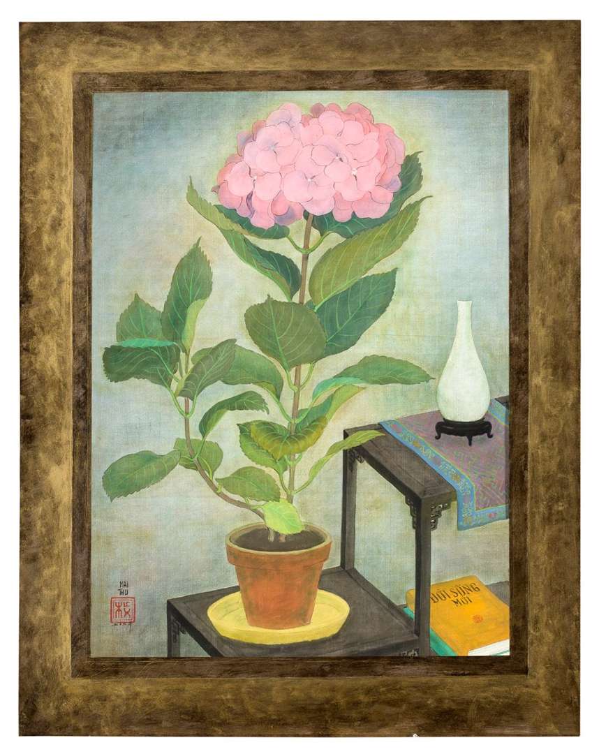 Un hortensia en pot, un vase et des livres sont posés sur un meuble en bois sculpté typiquement asiatique. La maîtrise du pinceau de Mai Thu permet d’évoquer la grâce de la nature, le renouveau végétal grâce à cette fleur aux pétales roses superbement représentés. Le tissu sous lequel est disposé le vase rappelle la délicatesse des broderies asiatiques. Pourtant, au-delà de cette apparente simplicité, le peintre parvient à insuffler une légère dimension idéologique. En effet, le livre mis en évidence et titré « Doi Song Moi » s’érige comme un symbole de la cause patriotique. Rédigé par Ho Chi Minh, fondateur de la République Démocratique du Viet Nam, ce livre qui pourrait être traduit par « Nouvelle vie » apporte un éclairage sur les principes à adopter par les citoyens. Apprécié par le milieu artistique, le nouveau régime redéfinit le rôle de l’artiste. Celui-ci se doit d’appuyer la cause nationale grâce à une production artistique patriotique et servant d’outil de propagande. Marqué par la colonisation française mais aussi par l’impérialisme japonais, le Vietnam désire construite son identité propre. Si les nouveaux élèves de l’Ecole des Beaux-Arts ont intégré ces préceptes à leurs expressions artistiques, les premières générations évoquent différemment leur adhésion à la cause populaire. Ainsi dans Composition à l’hortensia, Mai Thrung Thu ne renie pas l’héritage occidental de son apprentissage mais le représente conjointement à ses origines. Réalisée en 1955, un an après l’indépendance du Vietnam, l’artiste affiche fièrement ses convictions bien que résidant en France, et contribue à sa façon au soutien de son pays d’origine.