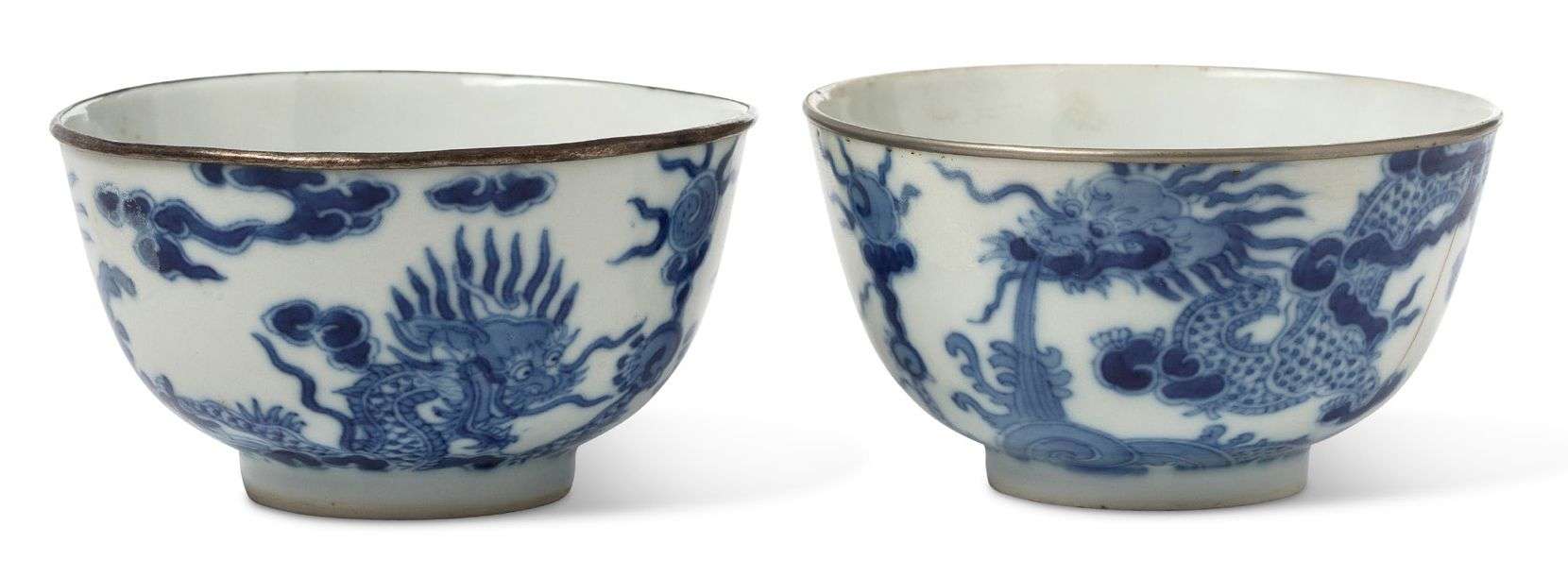 Paire de petits bols bleu-blanc cerclés de métal, à décor de dragons poursuivant la perle sacrée.