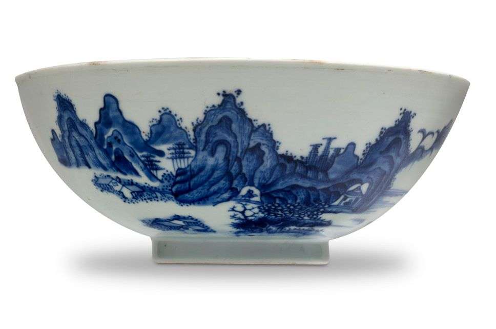 Bol en porcelaine bleu-blanc à décor de calligraphies et oiseau. Une étiquette d’époque au revers, traduisant le poème en Nôm du seigneur Nguyên Phúc Chu à propos du site de Tam Thai.