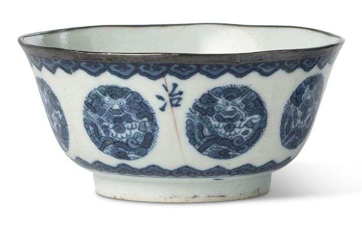 Hai chiếc chén lục giác bằng sứ trắng men lam vẽ viên long. Một chiếc bọc kim loại ở viền chén.