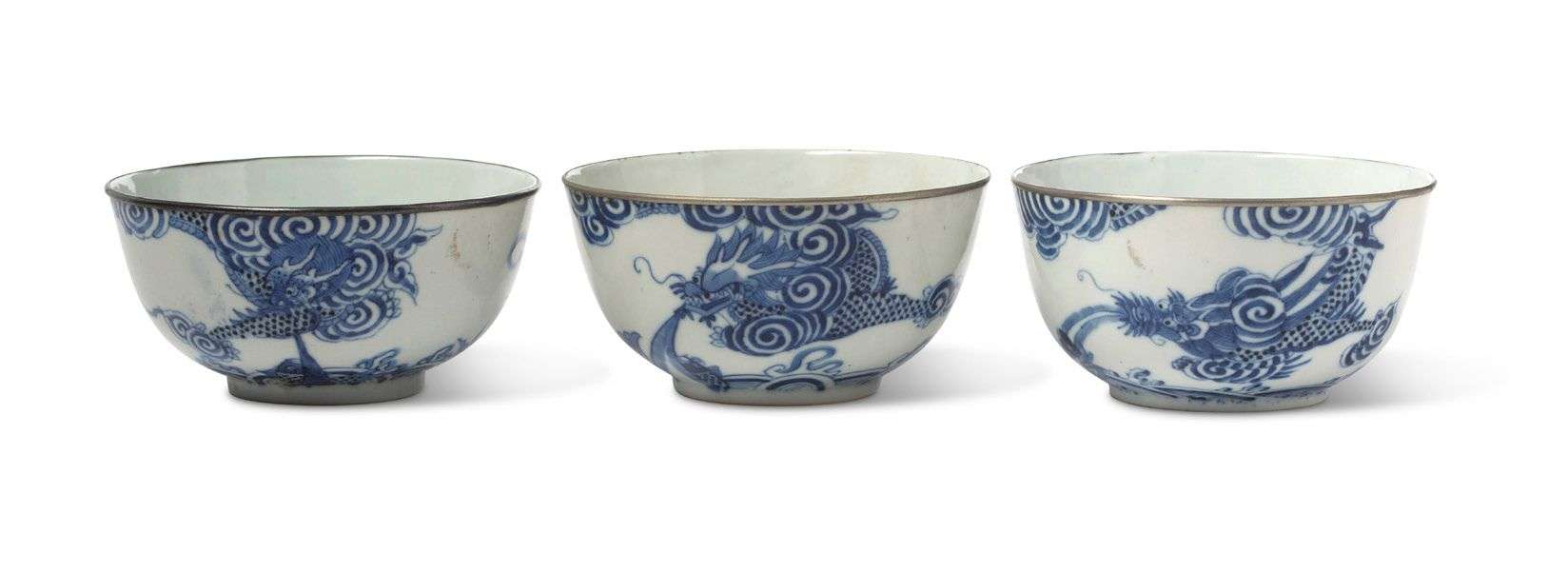 Ensemble de six bols cerclés de métal, en porcelaine à décor en bleu sous couverte de dragons et carpes, phénix et rouleaux de lettrés, avec marque au revers : Noi Phu ou Ngoan Ngoc