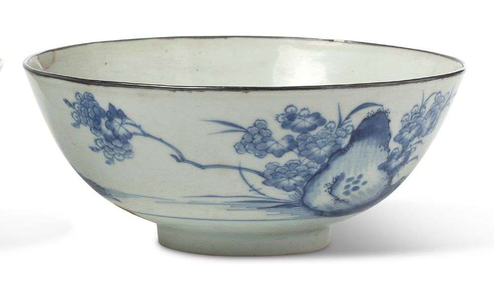 Un bol en porcelaine bleu-blanc cerclé de métal, à décor calligraphié et d’un couple de canards mandarins, symbole de fidélité.