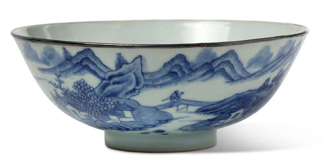 Bol évasé en porcelaine dite «Bleu de Huê» à décor de pêcheur dans un paysage lacustre, un poème calligraphié sur le haut.