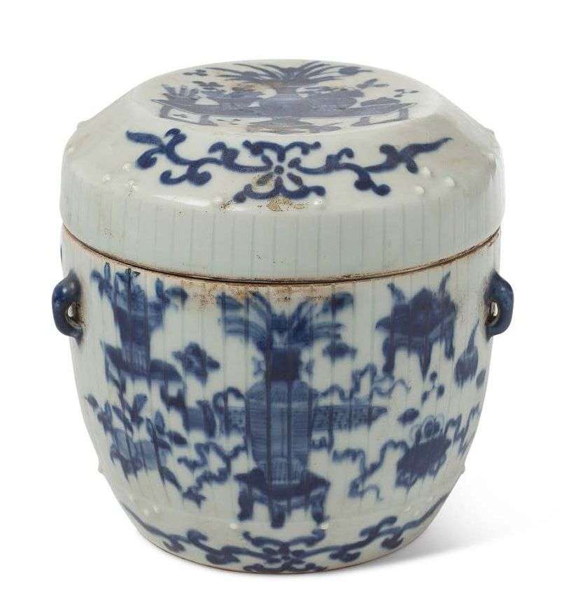 Pot couvert en porcelaine bleu-blanc à décor de bouquets garnis et objets mobiliers.