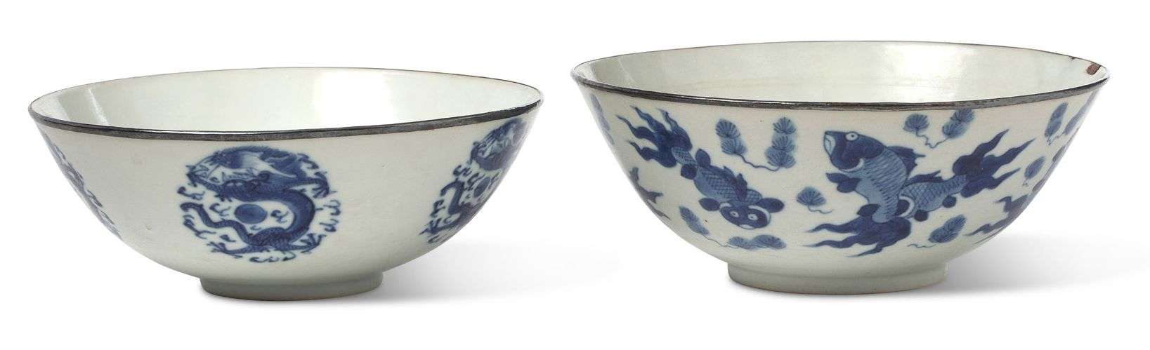 Ensemble comprenant deux bols en porcelaine bleu-blanc cerclés de métal, l’un à décor de poissons-voiles, l’autre à décor de dragons lovés dans des médaillons.