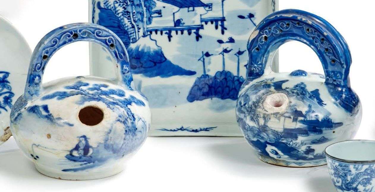 Deux pots à chaux en porcelaine bleublanc à décor de paysage lacustre pour l’un et de sage pêcheur pour l’autre. Les anses en haut-relief à décor stylisé de frises en spirales.