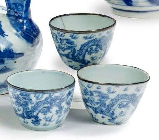 Service à thé composé de trois petites tasses et d’une soucoupe en porcelaine bleublanc cerclée de métal à décor de dragons et phénix pourchassant la perle sacrée parmi des nuages stylisés.