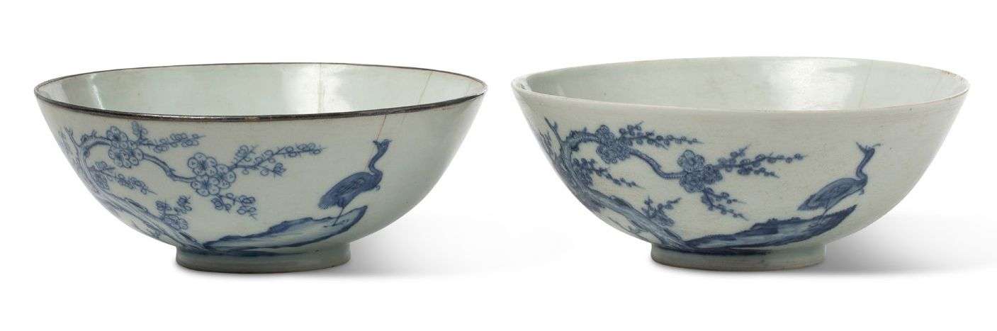 Deux bols en porcelaine bleu-blanc à décor de prunus, oiseau et poème des trois amis, dont l’un cerclé de métal.