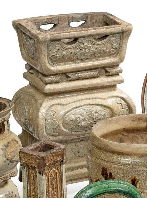 Lư hương bốn chân bằng gốm men rạn, trang trí viên long đắp nổi, chữ thọ cách điệu ẩn hiện sau những dải lụa. Bốn con chim phượng tại bốn góc dưới.